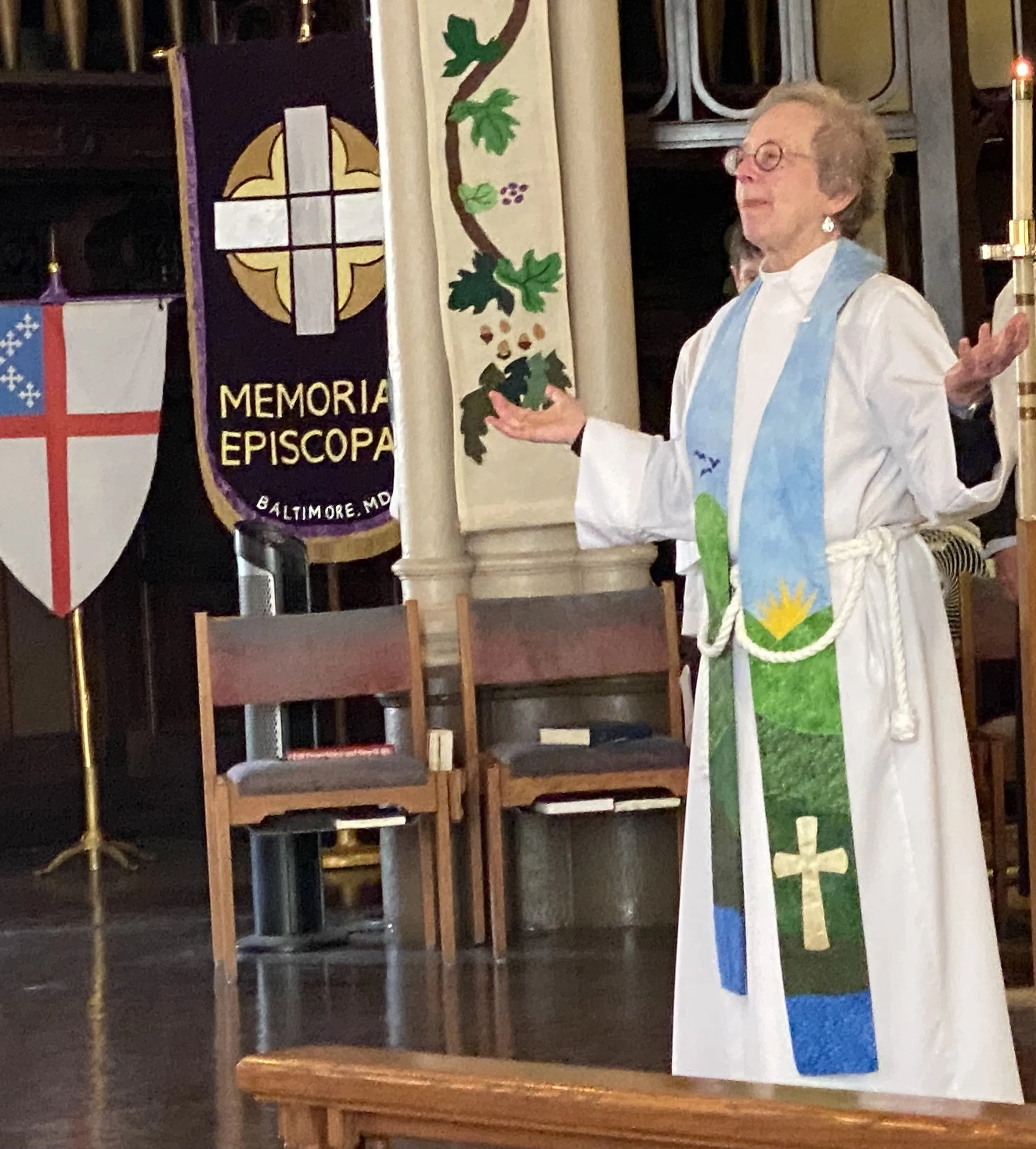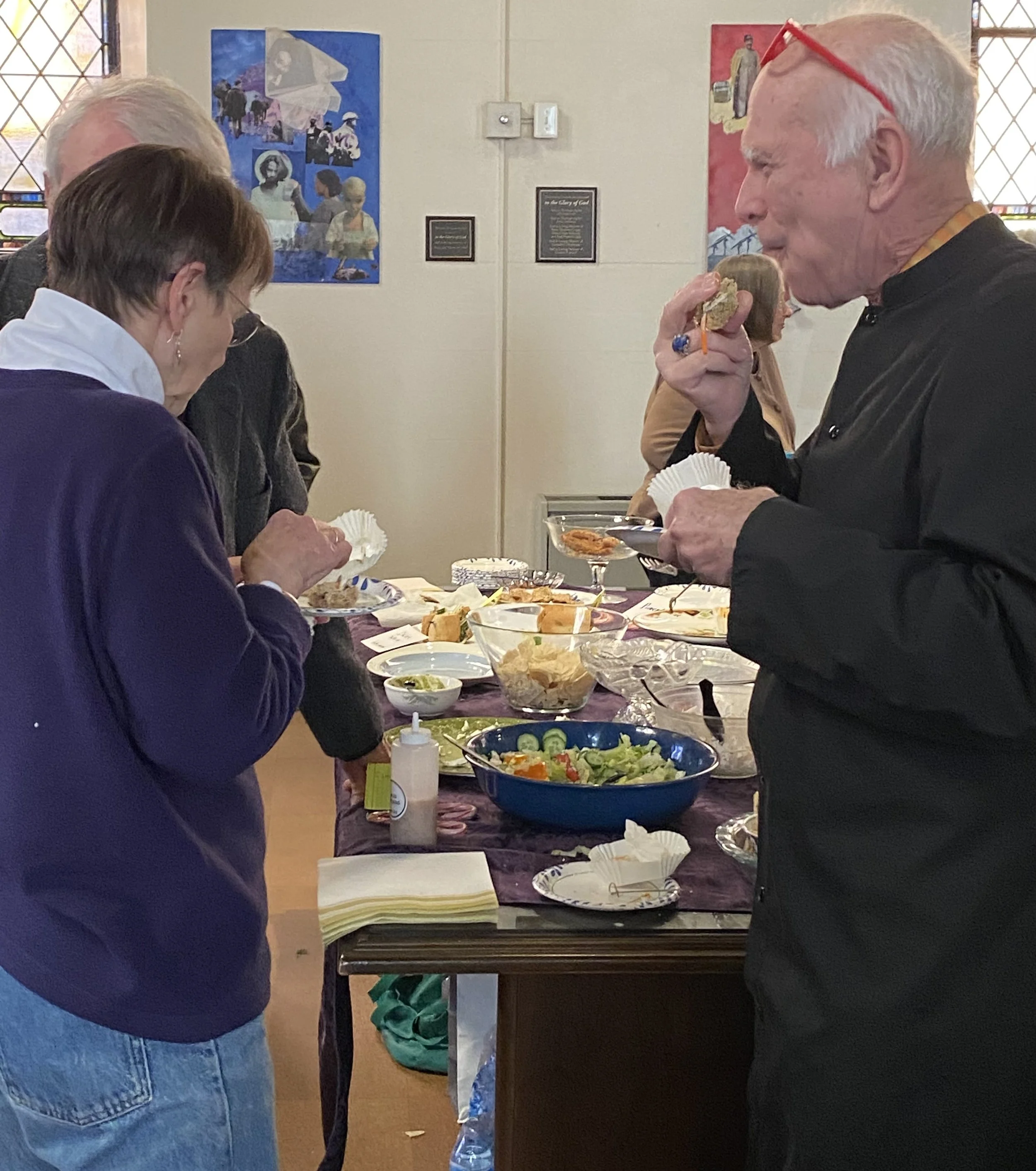 If you like, after the service you can share in simple savory and sweet snacks with coffee and flavored water in the sanctuary as you browse the current art on display or visit with our friendly parishioners.